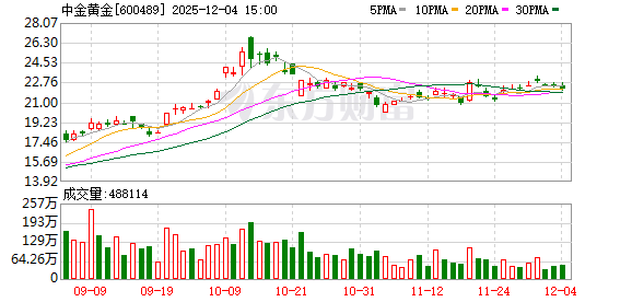 中金黄金12月4日大宗交易平台出现一笔成交,成交量31.60万股,成交金额699.31万元,大宗交易成交价为22.13元。该笔交易的买方营业部为国泰海通证券股份有限公司总部,卖方营业部为中信证券股份有限公司上海分公司。